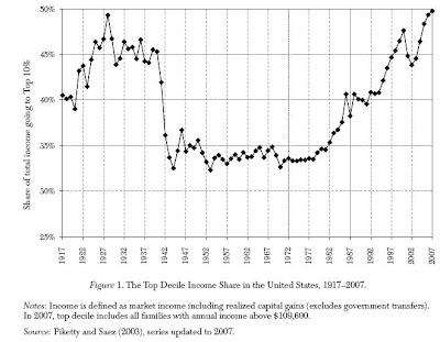 First look at the share of income going to the top decile--that is, the top tenth--of the income distribution. This follows a U-shaped pattern: after rising in the 1920s, the share of income going to the top tenth drops in the Depression, stays relatively fixed from the 1940s up through the 1970s, and rises since then.