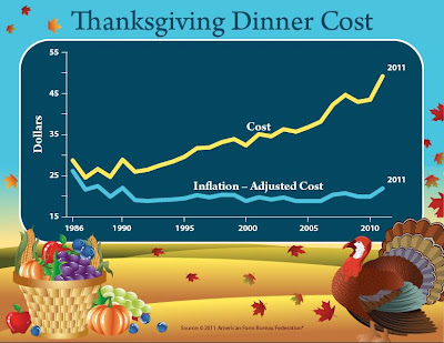 The top line of this graph shows the nominal price of purchasing the basket of goods for the Classic Thanksgiving Dinner. One could use the underlying data here to calculate an inflation rate: that is, the increase in nominal prices for the same basket of goods was 13% from 2010 to 2011. The lower line on the graph shows the price of the Classic Thanksgiving Dinner adjusted for the overall inflation rate in the economy. The line is relatively flat, which means that inflation in the Classic Thanksgiving Dinner has actually been a pretty good measure of the overall inflation rate in the last 26 years. But in 2011, the rise in the price of the Classic Thanksgiving Dinner, like the rise in food prices generally, has outstripped the overall rise in inflation.