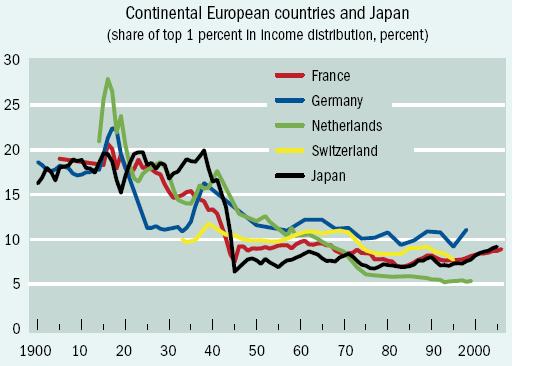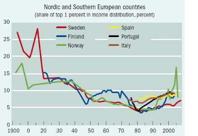 Here's a short explanation of the logic behind the Kuznets curve from Branko Milanovic in the September 2011 issue of Finance and Development has several articles with perspectives on inequality. "The Kuznets curve, formulated by Simon Kuznets in the mid-1950s, argues that in preindustrial societies, almost everybody is equally poor so inequality is low. Inequality then rises as people move from low-productivity agriculture to the more productive industrial sector, where average income is higher and wages are less uniform. But as a society matures and becomes richer, the urban-rural gap is reduced and old-age pensions, unemployment benefits, and other social transfers lower inequality. So the Kuznets curve resembles an upside-down `U.'"In 2011, of course, the notion that inequality always declines as an economy grows no longer seems plausible. Later in the same issue, Facundo Alvaredo offers some nice figures of trends in inequality around the world since about 1900, where inequality is measured by the share of total income going to the top 1% of the income distribution. There are four figures, each with a group of countries. "In Western English-speaking countries, inequality declined until about 1980 and then began to grow again. Continental European countries and Japan had a decline until about 1950; since then income distribution has leveled. For Nordic and Southern European countries, the drop in inequality in the