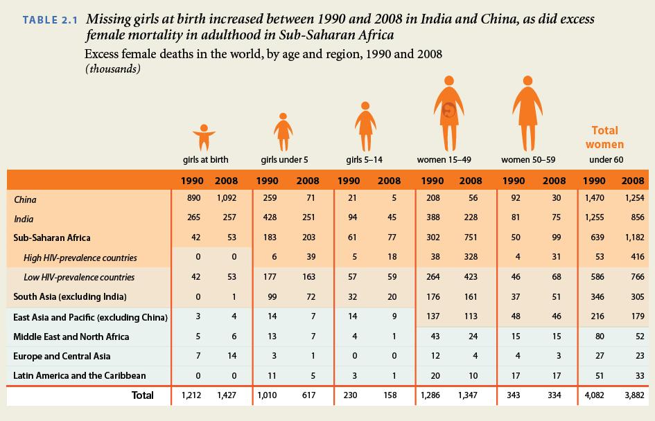 "First, the problem of skewed sex-ratios at birth in China and India (and in some countries in the Caucasus and the Western Balkans) remains unresolved (table 2.1). Population estimates suggest that an additional 1.4