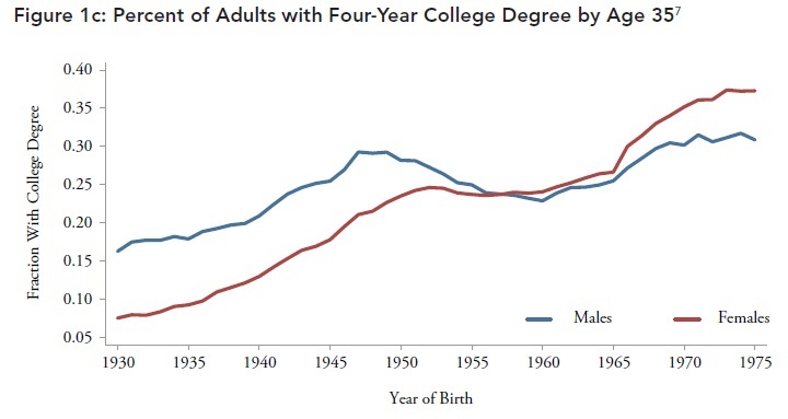 Educational achievement for men went backward for a time, and has only recently been recovering back toward the levels of the 1960s. Here's a figure showing the pattern for the share of 35 year-olds who have completed a four-year college degree, but similar patterns arise if one looks at completing high school, or completing some college, or other measures of education.