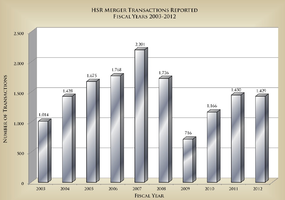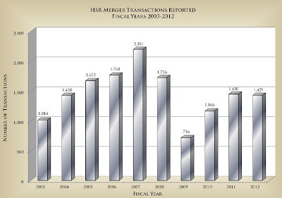 Under the Hart-Scott-Rodino legislation, all mergers above a certain size (about $68 million in 2012, rising to $71 million in 2013) are required to notify the antitrust authorities in advance when a merger is proposed. Here's a figure showing merger transactions reported over the last 10 years.