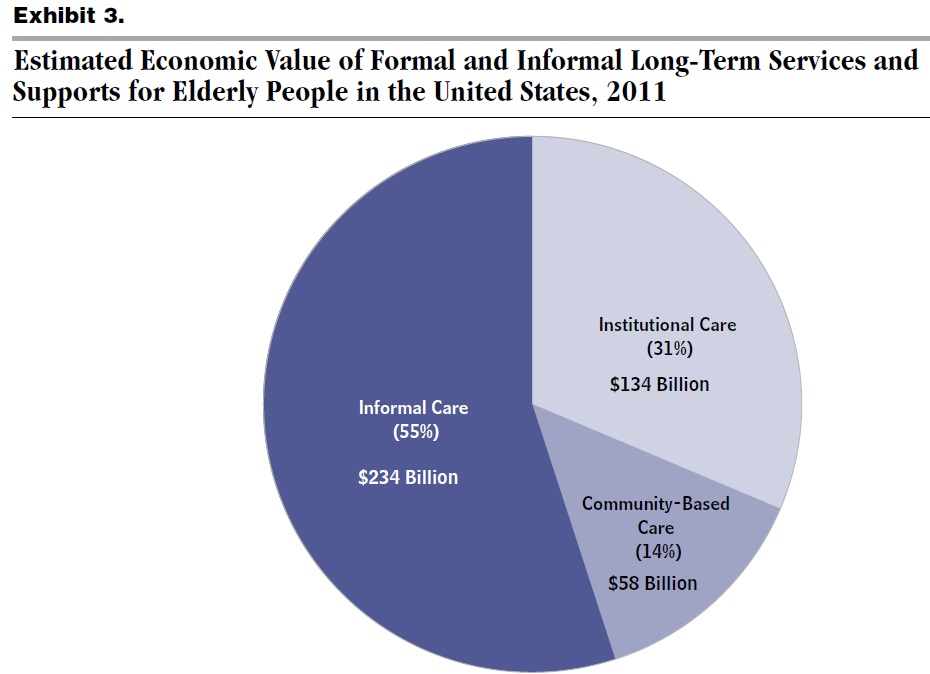 At present, the majority of the value of the provision of long-term care services is provided by "informal care"--that is, care provided without compensation by family and friends. The CBO estimated the value of this care by looking at estimates of the number of hours involved, and then valuing that time at $21/hour, which is roughly the average cost of hiring someone to provide this kind of care.