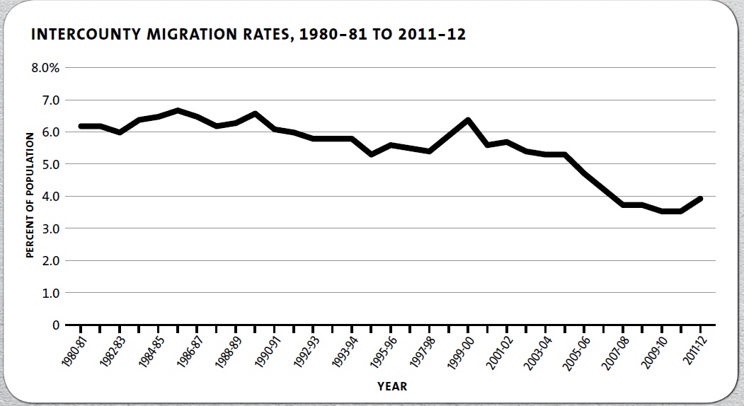William Frey presents some recent evidence on the within-the-U.S. migration rate in a short overview article in the Milken Institute Review, July 2013. He writes: "In 2011-12, 14 states (most of