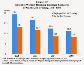 A certain amount of job training happens through the basic experience of showing up for work everyday. But in some cases, more specific training is called for, which can either be sponsored or provided by an employer, or by the worker. Here's some evidence from the recently released 2015 Economic Report of the President, by the Council of Economic Advisers, showing a decline in employer-provided and on-the-job training in recent decades. This data is collected only irregularly, when the Census Bureau decides to include the "module" that includes this particular set of questions. But with the most recent data in 2008, it seems pretty unlikely that employer-provided and on-the-job training have risen in the aftermath of the Great Recession.