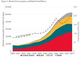 "The [grain] price jumps since 2005 are best explained by the new policies causing a sustained surge in demand for biofuels. The resulting reduction in available per capita supply of food and animal feed could not be accommodated by drawing on  available stocks, as they had in the past when there were temporary shortages created by yield shocks. Instead, the necessary adjustments included an expansion of global net acres planted to grains, especially in Latin America and the former Soviet Union, and by reduced per capita consumption of grains and products from animals fed on grains.  ... The rises in food prices since 2004 have generated huge wealth transfers to global landholders, agricultural input suppliers, and biofuels producers. The losers have been net consumers of food, including large numbers of the world’s poorest peoples. The cause of this large global redistribution was no perfect storm. Far from being a natural catastrophe, it was the result of new policies to allow and require increased use of grain and oilseed for production of biofuels."