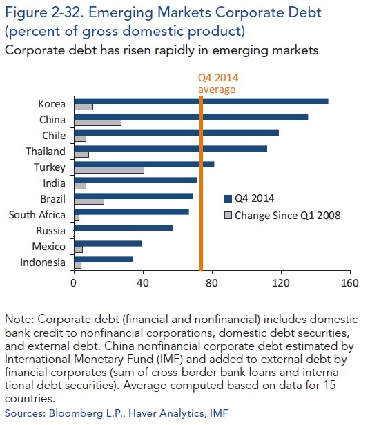 These issues also spill over into emerging market debt. Here's a figure showing the level of corporate debt (not including government or household debt) in some emerging markets. Speaking of this debt in emerging markets, the report notes: