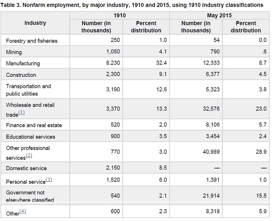 In terms of the nonfarm industries where people worked, about one-third of the workforce was in manufacturing in 1910, compared with under 9% today. The share of the nonfarm workforce in construction was about twice as high in 1910 as today (9.1% then vs. 4.5% now), and the share working in transportation and public utilities was three times as high in 1910 as today (12.6% then vs. 3.8% now). Nearly 15% of the workforce was in domestic or personal service back in 1910, compared with about 1% today. On ther other side, the share of workers in "other professional services" has climbed from 3% in 1910 to 28.9% today, and the share working in wholesale and retail trade and in government have also climbed notably.