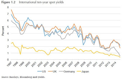 Today's ultra-low interest rates aren't just a result of the Great Recession and its aftermath. The "spot yield" on 10-year government bond (which can be thought of as the rate on a zero coupon bond), has been declining since the mid-1990s. Here's a figure from Bean, Broda, Ito, and Kroszner, who write:
