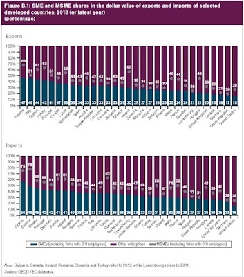 The pattern is different if you look at not the share of exports from small and medium firms, but instead at the share of exporting firms that are small and medium firms. In the US, for example, the micro, small, and medium firms make up about 26-28% of the value of trade. But of the total number of US firms involved in international trade, micro, small, and medium firms make up more than 90%. Here's the figure: