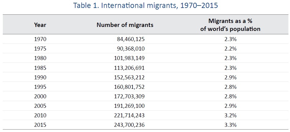 "The current global estimate is that there were around 244 million international migrants in the world in 2015, which equates to 3.3 per cent of the global population. A first important point to note is that this is a very small minority of the global population, meaning that remaining within one’s country of birth overwhelmingly remains the norm. The great majority of people in the world do not migrate across borders; much larger numbers migrate within countries (an estimated 740 million internal migrants in 20093). ... Current data indicate that in 2016 there were 40.3 million internally displaced persons (IDPs) worldwide and 22.5 million refugees. Further, the total number of people estimated to have been displaced globally is the highest on record. ...