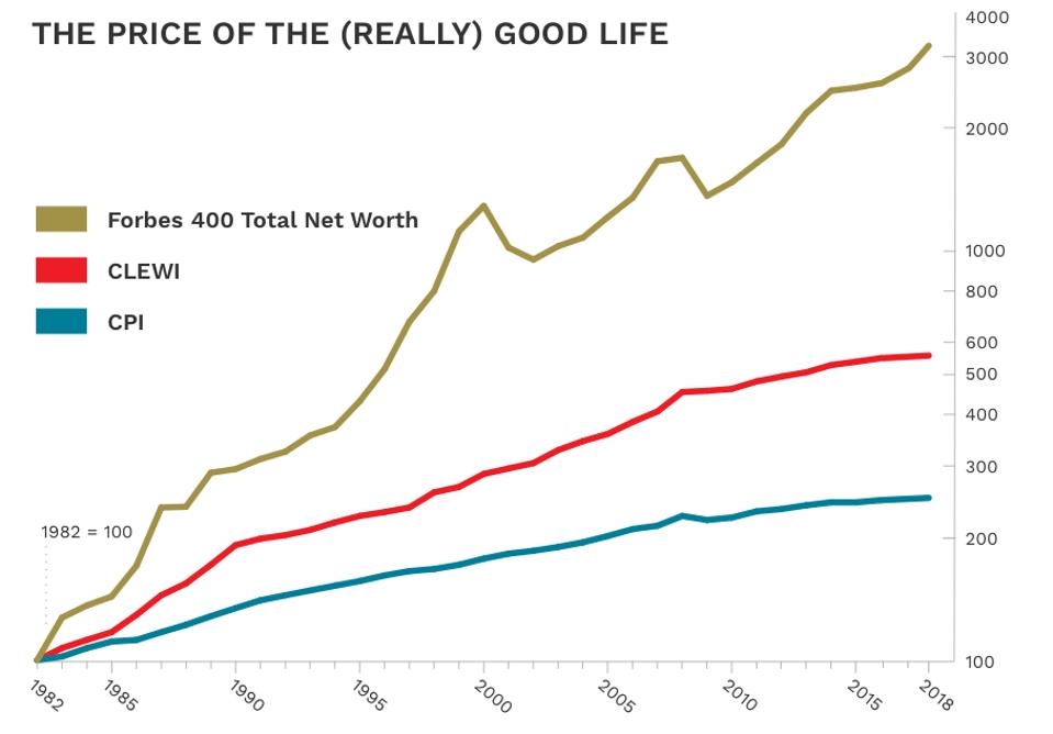 Some non-government groups have used the idea of a basket of goods as the basis for an annual article or report. For example, Forbes magazine publishes an annual Cost-of-Living-Extremely-Well Index (CLEWI). The index is based on 40 luxury items: for example, an ebonized Model D concert-grand Steinway piano in New York; a pair of 12-gauge side-by-side sporting shotguns from James Purdey & Sons in New Jersey; 12 cotton bespoke shirts from Turnbull & Asser in the UK; a Jules Audemars self-winding, 18-karat pink gold, alligator strap, Audemars Piguet Swiss watch; a case of Dom Perignon champagne; installing a Har-Tru crushed stone tennis court in Connecticut; and others. The CLEWI has been rising faster than the Consumer Price Index over time, but luckily for the very rich, the net worth of the Forbes 400 has risen faster still.