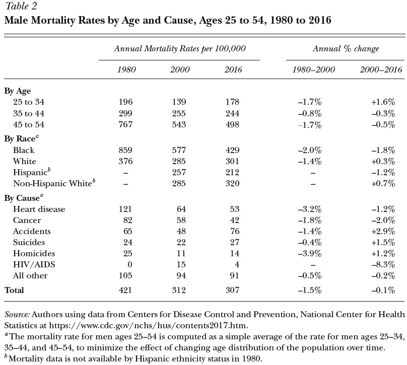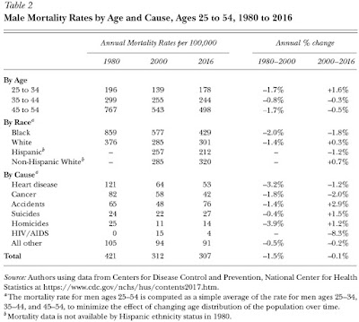 This drop-off in labor force participation has been accompanied by a wave of other symptoms, as discussed in the paper by Coile and Duggan. As one example, consider mortality rates for prime-age men, using their table.
