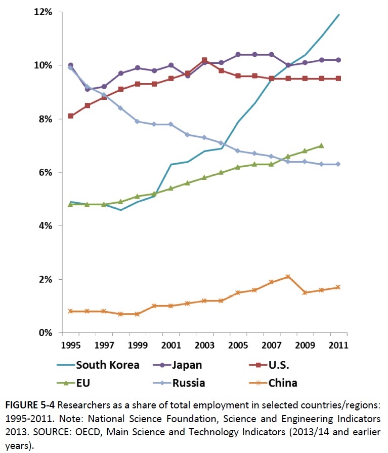 "Another indication of how well the United States is competing for international STEM workers comes from data on the number of high-skilled foreign-born workers in the 20 leading destination nations. From 1980 to 2010, the percentage of high-skilled migrants living in the United States relative to the other top destinations rose from 46 percent to 49 percent, even as the total number rose by more than four-fold. Similarly, data from the World Intellectual Property Organization showed that from 2001 to 2010, the flow of inventors around the world was dominated by flow into the United States, while OECD data shows that the United States remains the main destination for international
