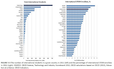 A lot of the NAS report considers public policies from different countries about high-skilled immigration. The US stands out as a country that has not been especially encouraging to high-skilled immigration, but seems to get a disproportionate share of those immigrants nonetheless. As the report points out, in the United States, about 70% of immigration is family related, another 15% is humanitarian, and the remaining 15% is employment-based (which includes temporary high-skilled immigrants). In Canada and Australia, by contrast, about 30-40% of immigration is family-based or humanitarian, and the remaining 60-70% is employment-based. But as Lowell noted (according to this paraphrase), the US still does very well in the global contest for talent: