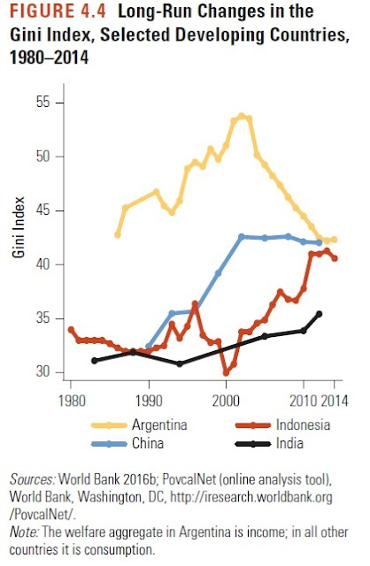 But even as global inequality is falling, inequality is rising not only in the US, but also in a number of developing economies like China, Indonesia, and to a lesser extent India.