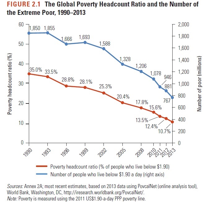 Global poverty, measured by the number of people living on $1.90 or less per day, has fallen dramatically in the last couple of decades. The blue line (right axis) shows the decline in the total number of the world's poor. The red line (left axis) shows the percentage of the world's population below the poverty line. The fall from 35% just 25 years ago in 1990 to about 10% at present is a dramatic improvement.