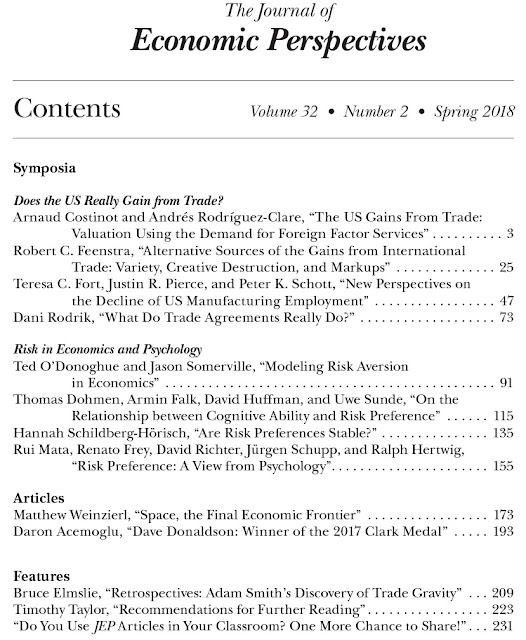 Journal of Economic Perspectives. The JEP is published by the American Economic Association, which back in 2011 decided--to my delight--that it would be freely available on-line, from the current issue back to the first issue. Here, I'll start with Table of Contents for